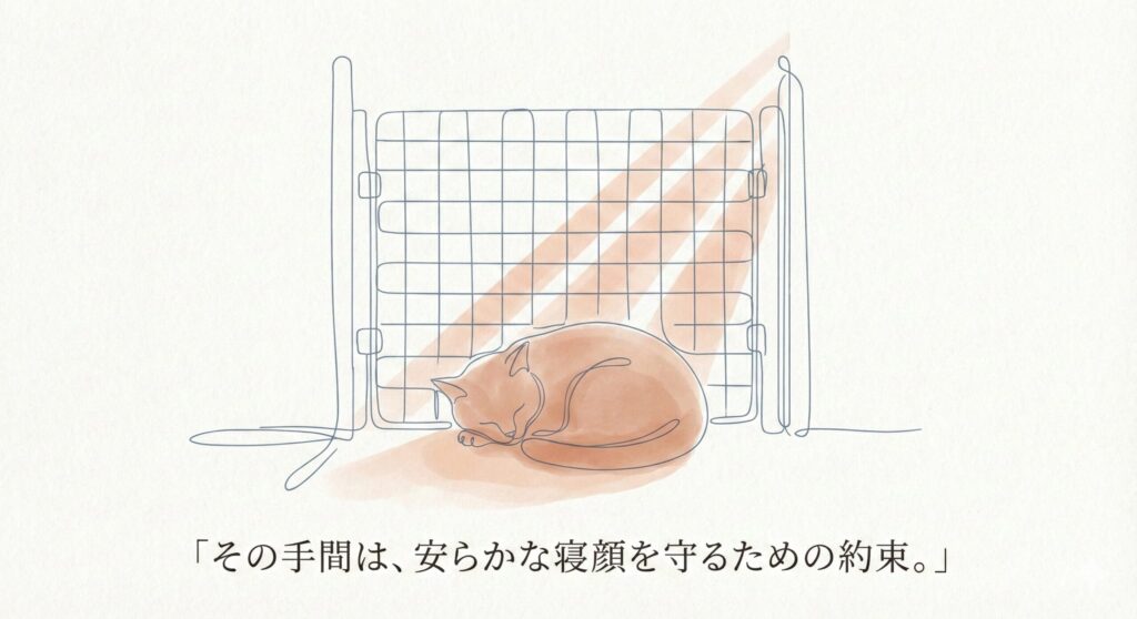 本記事で紹介するDIYは、すべての猫の脱走を100%防止するものではありません。猫の性格や身体能力、設置環境により強度は異なります。定期的な点検(突っ張り棒の緩み確認等)を行い、必ず飼い主様の責任において運用してください。