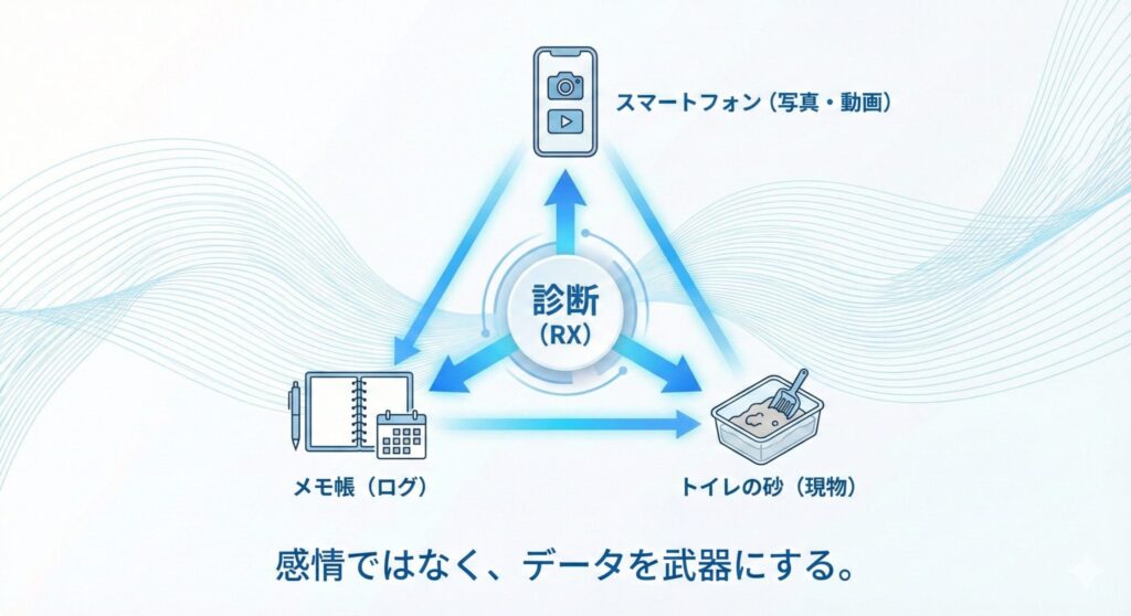 「『なんとなく元気がない』という主観は危険度チェックの役に立ちません。『昨夜22時にカリカリを5g食べ、その後嘔吐。排尿なし』という**数値化された事実**こそが、誤診を防ぐ最大の武器になります」