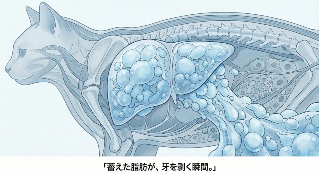 「肝リピドーシス(脂肪肝)をご存知ですか? 猫、特に肥満気味の猫が絶食すると、体は急激に脂肪を分解してエネルギーを作ろうとします。しかし、猫の肝臓はその処理能力が低く、分解された脂肪で肝臓が埋め尽くされ、機能不全に陥るのです」