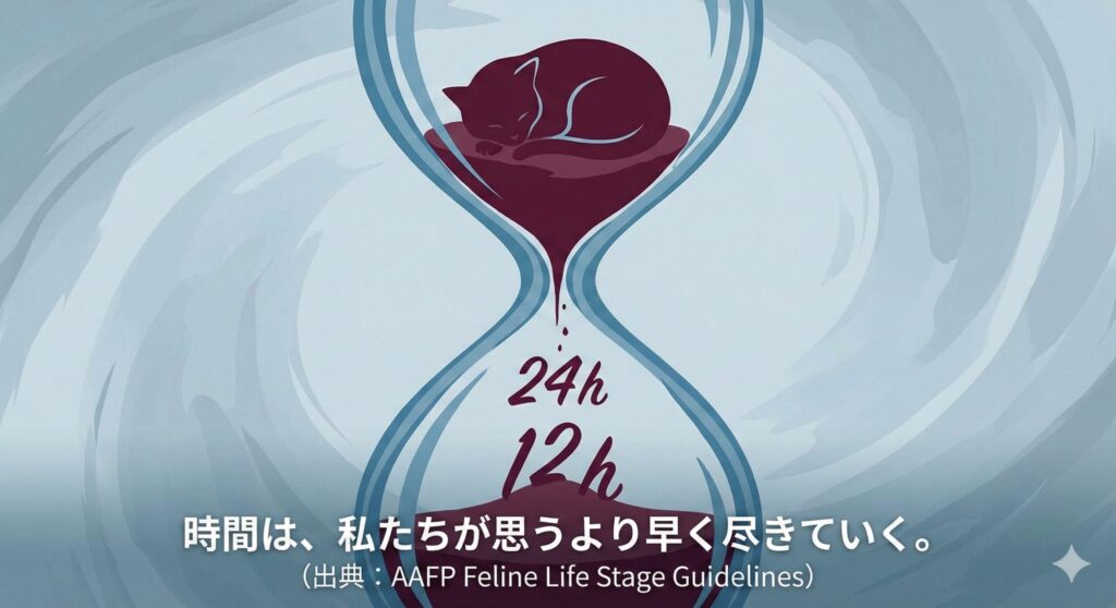 「獣医学的なエビデンスに基づいて申し上げます。『元気があるから様子見』は、最も危険なバイアスです。 米国猫獣医師協会(AAFP)のガイドラインや複数の内科学書を参照しても、以下の時間は『生理的限界』とされています」